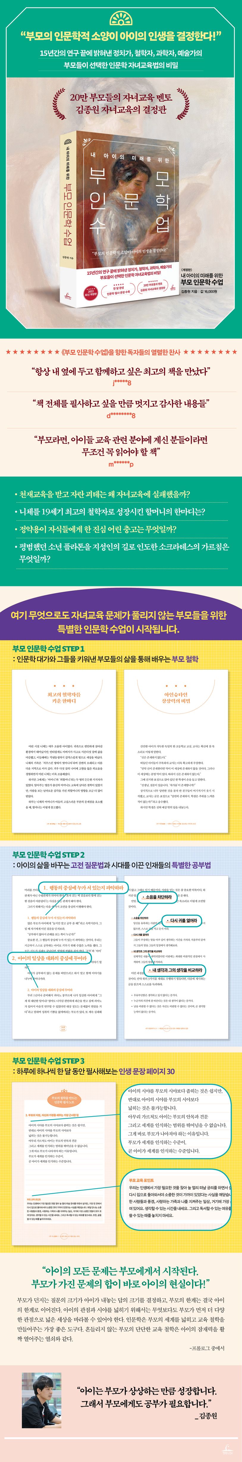 저자는 이 책을 통해 자녀교육의 핵심을 관통하는 인문학적 대원칙을 대중적인 언어로 풀어내고자 애썼다. 괴테, 아인슈타인, 니체, 신사임당 등 인류 역사상 최고의 지성인들을 길러낸 부모들의 교육 철학을 들여다보며 ‘부모가 아이에게 무엇을 가르쳐야 하는가’에 대한 올바른 해답을 찾을 수 있도록 돕는다. 또한 시대를 이끌고 앞서나간 그들만의 공부법과 사색법, 글쓰기 비결까지도 자세히 담았다. 새로워진 《부모 인문학 수업》개정판에는 20만 부모들의 인문학 자녀교육 멘토로서 저자가 오랜 시간 정리하고 직접 삶에 적용했던 ‘인문학 인생 문장’들을 수록했다. 하루에 한 장씩 30일 동안 필사하며 단단한 부모 철학을 완성시킬 수 있기를 바란다. 함께 수록된 ‘부모 교육 포인트’를 찬찬히 살펴보며 김종원 작가의 깊은 통찰을 실생활에 적용할 수 있는 노하우도 함께 배울 수 있을 것이다.