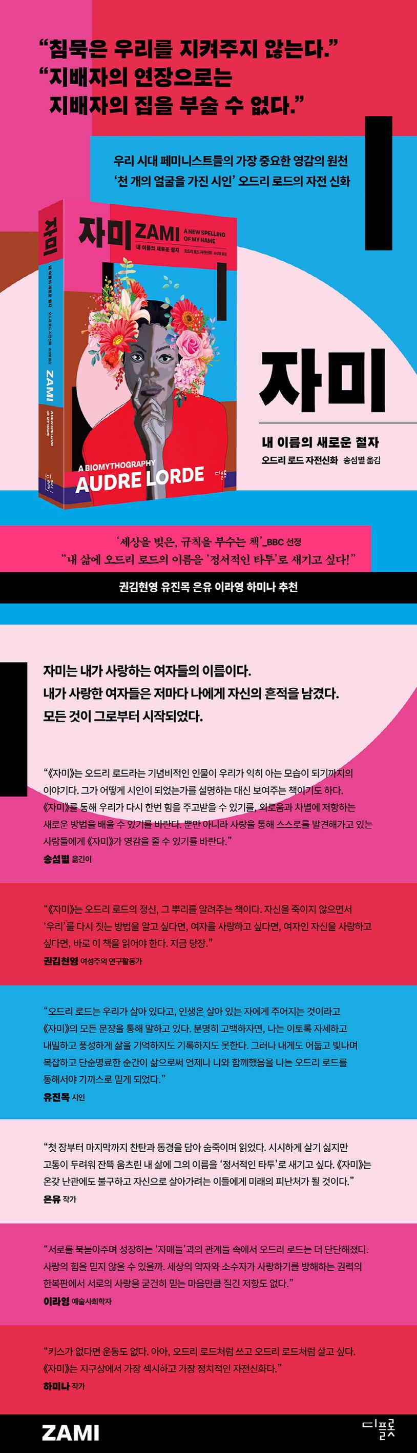 “침묵은우리를지켜주지않는다.”“지배자의연장으로는지배자의집을부술수없다.”이두문장은시간의흐름속에서도꺾이지않는오드리로드의불굴의정신을담고있다.《자미》는그정신의뿌리를알려준다.이책에는저자에게흔적을남긴아름답고강한여자들에대한이야기로가득하다.자신을죽이지않으면서‘우리’를다시짓는방법을알고싶다면,여자를사랑하고싶다면,여자인자신을사랑하고싶다면,바로이책을읽어야한다.지금당장.