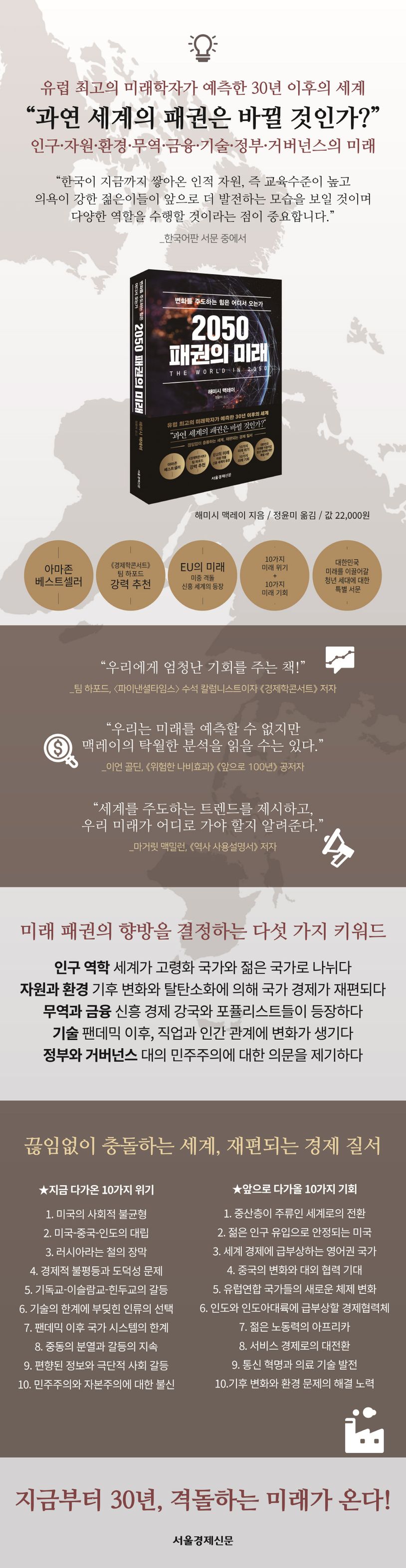 전 세계 경제, 비즈니스, 사회의 동향을 분석하고 예측하는 유럽 최고 연사, 글로벌 트렌드 분석가 해미시 맥레이가 전하는 앞으로 30년 이후의 세계에 대한 미래 보고서 《2050 패권의 미래(원제: The World in 2050)》가 출간됐다. 맥레이는 현재 〈인디펜던트〉의 수석 경제 평론가이자 부편집장, 〈런던이브닝스탠더드〉의 칼럼니스트로 활동하고 있으며 〈이코노미스트〉에서 발간한 《2020 세계경제대전망》의 필진으로도 참여했다. 또한 1994년에 이미 30여 년 이후의 세계를 내다본 《2020년(The World in 2020)》으로 주목을 받은 바 있다.