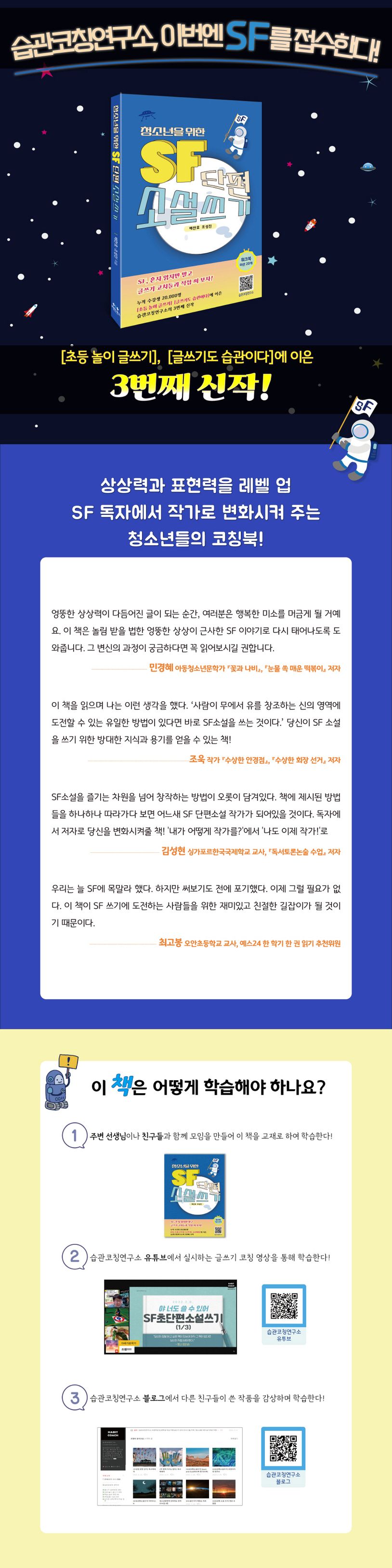 바야흐로 SF문학이 꽃피는 계절이 왔다. SF문학은 더 이상 성인들의 전유물이 아니다. 점점 더 많은 청소년들이 SF의 매력에 빠져들고 있다. 습관코칭연구소는 SF 글쓰기 코칭을 통해 청소년들의 열기를 직접 확인할 수 있었다. 청소년들이 직접 창작한 SF단편소설 수십 편을 코칭하면서 감동을 받았지만 정작 청소년을 위한 SF문학 지도서나 코칭북은 전무했다.