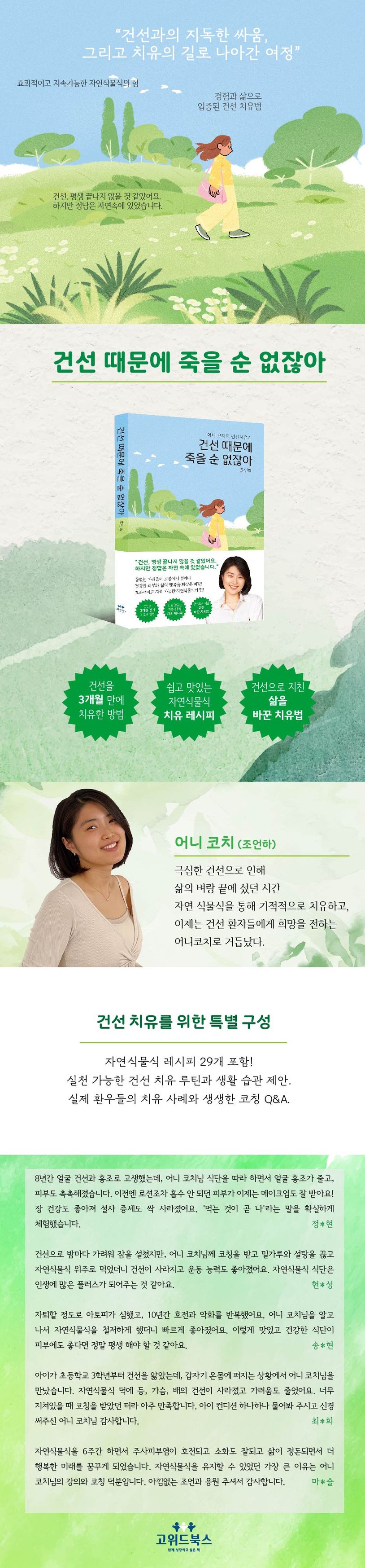 이 책은 어니코치의 치유 여정을 생생히 담아내며, 같은 고통을 겪는 건선 환우들에게 실질적인 도움과 위로를 건넵니다. 자신의 시행착오를 통해 완성한 자연식물식 레시피 20가지, 치유를 위한 생활 습관, 그리고 독자들이 가장 궁금해하는 Q&A까지 모두 담았습니다.