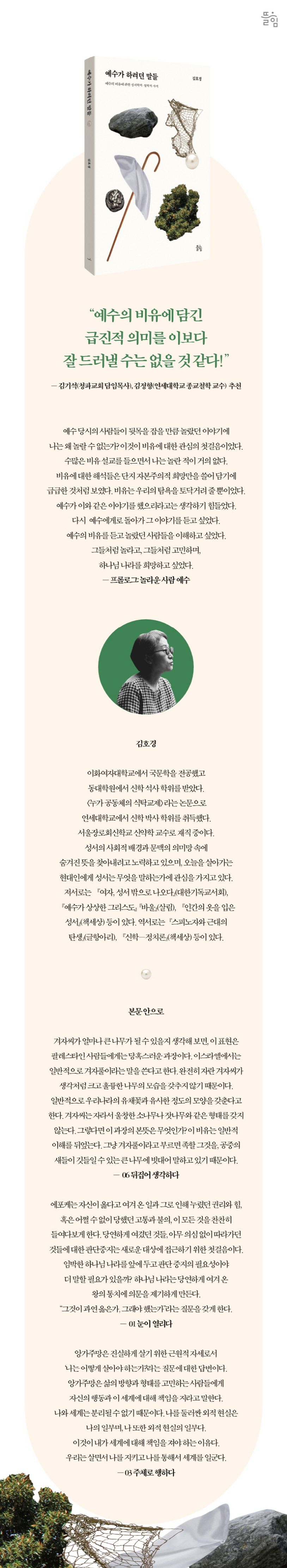 예수 당시의 사람들이 뒷목을 잡을 만큼 놀랐던 이야기에 나는 왜 놀랄 수 없는가? 이것이 비유에 대한 관심의 첫걸음이었다. 수많은 비유 설교를 들으면서 나는 놀란 적이 거의 없다. 비유에 대한 해석들은 단지 자본주의적 희망만을 쓸어 담기에 급급한 것처럼 보였다. 비유는 우리의 탐욕을 토닥거려 줄 뿐이었다. 예수가 이와 같은 이야기를 했으리라고는 생각하기 힘들었다. 다시 예수에게로 돌아가 그 이야기를 듣고 싶었다. 예수의 비유를 듣고 놀랐던 사람들을 이해하고 싶었다. 그들처럼 놀라고, 그들처럼 고민하며, 하나님 나라를 희망하고 싶었다.