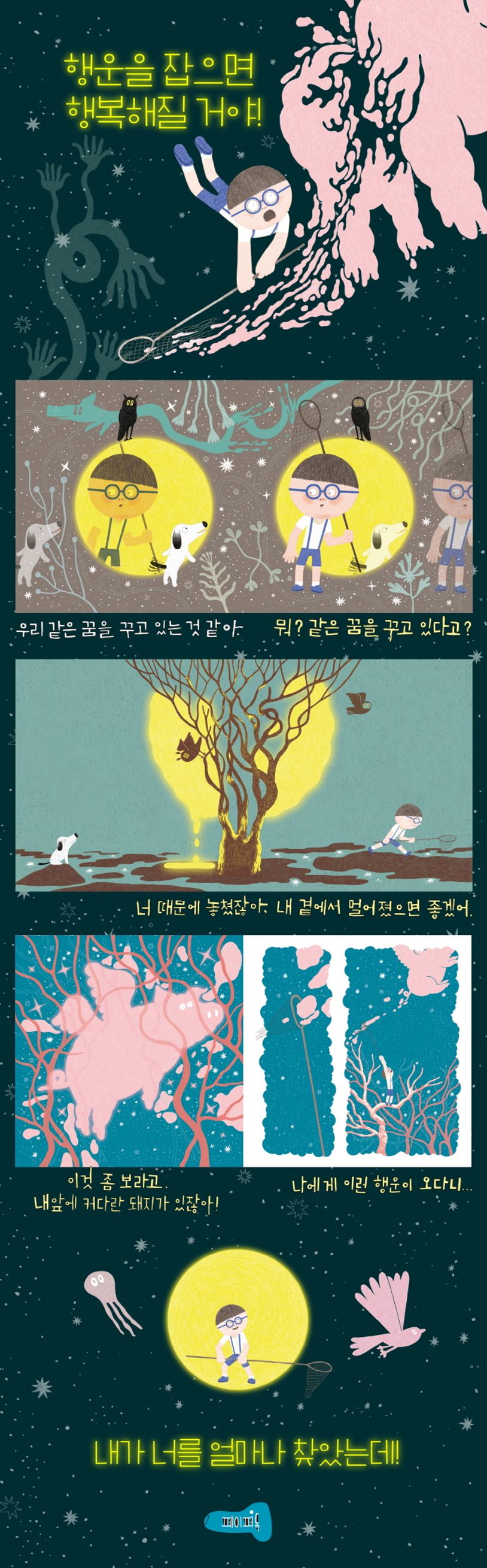 앗, 그런데 이게 왠일이죠. 그날 밤 꿈에 어마어마한 고목나무에 휘영청 황금 달이 뜨고 이내 커다란 핑크 돼지를 만납니다. 소년은 놀라움과 기쁨에 작은 심장은 콩닥콩닥 거리기 시작합니다. ‘아 이게 바로 말로만 듣던 행운에 돼지꿈!’ 소년은 꿈속에 돼지를 쫓기에 여념이 없습니다. 잡힐 듯 잡힐 듯 안 잡히고, 다가가면 다가갈수록 연기처럼 흩어지는 핑크돼지...