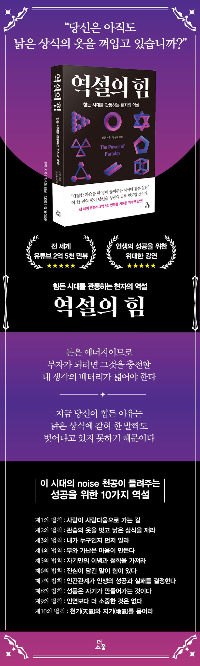 그러므로 우리 사회는 지금 냉철한 꾸짖음을 줄 수 있는 어른의 가르침이 절실하다. 이러한 때에 천공이 또 하나의 ‘역설’을 세상에 내놓는다. 유튜브 강연 중 일상에 도움이 될 만한 것들을 뽑고 거기에 간략한 추론을 달았다. 이 책이 세상의 모든 이에게 따뜻한 위안이 되고 가르침이 된다면 더할 나위가 없을 것이다.