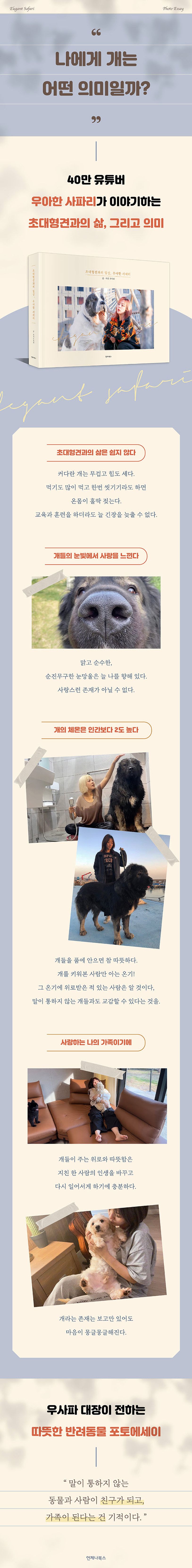 ‘나에게개는모든것을다줘도아깝지않을소중한가족,그이상이다.’반려동물은평생을함께하고책임질용기가필요하다반려동물을들인다는것은평생을함께하고책임질용기를가져야한다는걸의미한다.동물에대한지식은물론이고,많은인내와이해심도필요하다.한생명을책임진다는것을그리도쉽지않은일이다.물론경제적인여유는필수다.하지만아직도단순히귀엽고예쁘다며데려왔다가생각과다르다고파양하는사람이많다.곰만한초대형견을두마리나기르는40만유튜버‘우아한사파리(이하우사파)’는반려동물을기르는일이결코쉽지않지않은일이라고끊임없이말한다.그럼에도자신이개를기를수있는이유는바로사랑때문이라고.주인에게무한한신뢰와사랑을보내는개들,저자는그런개들의신뢰와사랑을온몸으로느낄때마다무척행복하다고이야기한다.그리고그행복은삶의원동력이되기도한다.때로는개가사람보다훨씬나은친구이자가족이다개들은말대신눈빛으로이야기한다.그눈빛에는사랑이담겨있다.주인만보면쉴새없이꼬리를흔들며온몸으로사랑을표현하기바쁘다.그뿐만이아니다.주인이기뻐하면같이기뻐하고,슬퍼하면함께슬퍼한다.바쁘고치열한삶속에몸과마음이지칠때개를안으면마음이포근해진다.그렇게말이통하지않는개와사람은친구가되고,가족이된다.단순히돌봐주는존재와돌봄받는존재라는관계를너머가족이된다는것은기적이다.개도나도,우리는함께성장한다누구에게나서툴고미숙한때가있다.아무데나오줌을싸고,옷이며신별이며물어뜯어혼나던강아지도조금씩사람과함께사는법을배운다.그렇게강아지가성장하는동안함께하는사람도함께배우고성장해간다.개들과함께성장하며살아가는모습을성실하게기록으로담아온우사파는이한권의책에행복했던순간들과집사로서자신의성장을짧고담백하지만진심을다해담았다.어쩌면이사랑스러운존재들이정말세상을구할지도!초대형견을기르는것은결코쉽지않다.주변의불편한시선을감내해야할뿐만아니라시간적으로도,체력적으로도,경제적으로도무엇하나만만한것이없다.우사파도인생의많은부분을개들을위해써야했다고고백한다.하지만조금의후회도없는것은개는사랑을주면,그사랑을배로갚기때문이라고한다.물론그사랑을직접느낄수있다면무척좋겠지만,그럴수없다면이책속티없이맑고순수한,사랑스러운존재의모습을통해서조금이라도그사랑을느낄수있길바란다.그사랑이모이고모이면정말로세상이더나아질수도있지않을까?