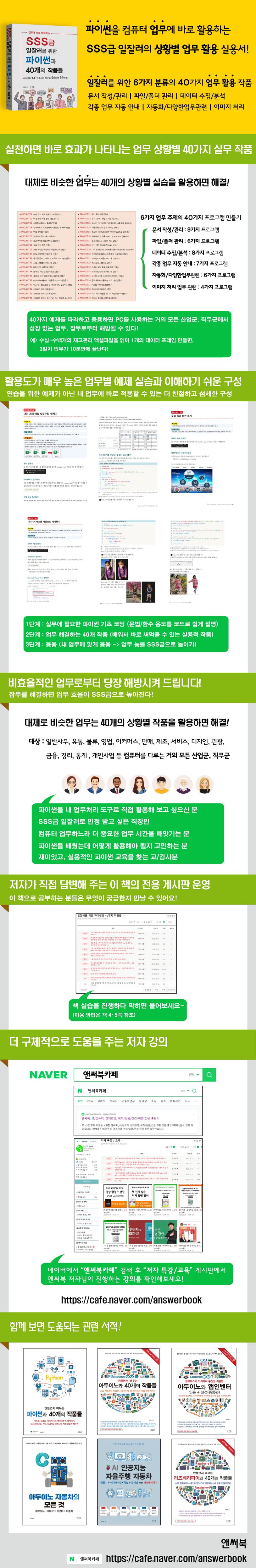 이 책은 파이썬을 내 업무에 활용하여 일처리 시간을 SSS급으로 단축시킬 수 있도록 6가지 주제의 40가지 프로그램을 직접 만들고 내 업무에 바로 응용할 수 있게 구성하였다.