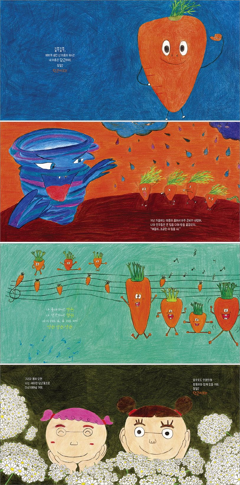 제주 동쪽 끝에 있는 마을, 구좌에서 석희 아저씨는 당근 농사를 지어요. 푸른 제주 바다와 봉긋이 솟아오른 오름 사이에 있는 밭에는 거센 태풍에도 꿋꿋이 견디며 유기물이 풍부한 흙 속에서 몸집을 키우는 당근들이 자라고 있어요. 당근은 노래합니다. 석희 아저씨네 쌍둥이가 당근을 많이 먹어야 눈도 좋아지고, 건강해진다고요. 당근은 노래합니다. 제주 할머니가 힘들게 수확한 당근들이 많이 팔려서 사람들이 당근을 많이 먹기를 바란다고요.