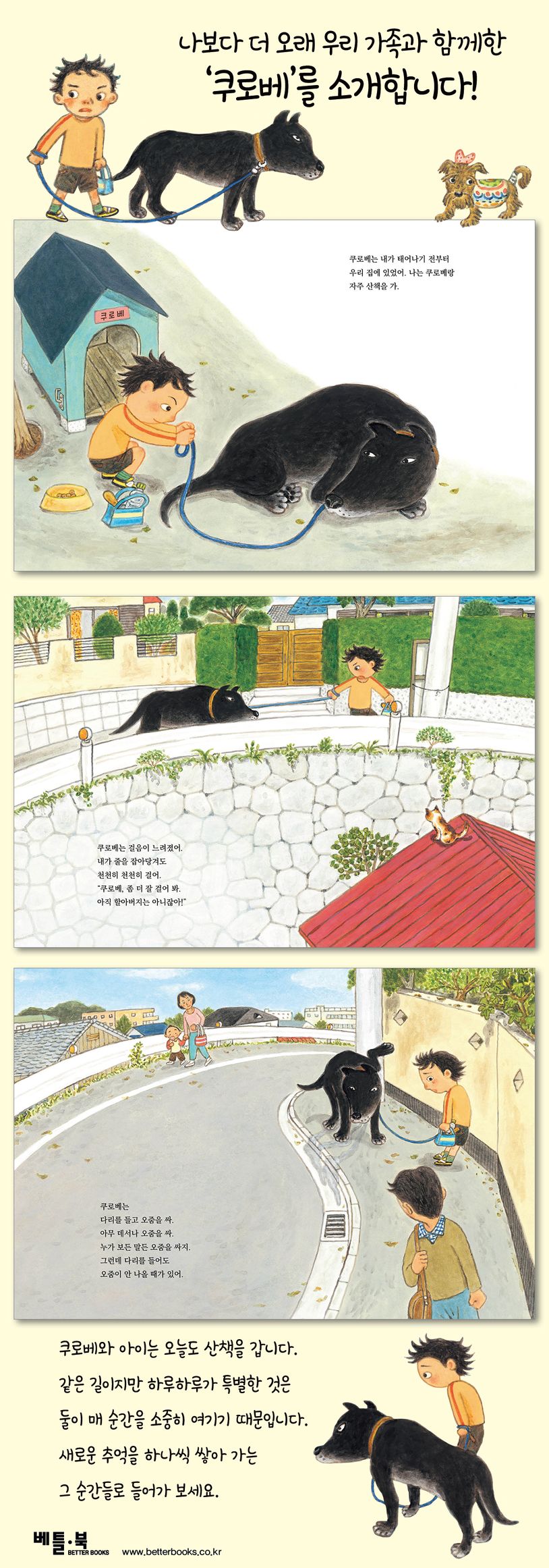 주인공 아이는 아마도 태어났을 때부터 까만 개 쿠로베와 함께했을 것입니다. 때로는 친형처럼 때로는 동생처럼 함께했던 시간만큼 둘 사이의 믿음은 굳건하겠지요. 말은 통하지 않지만 서로를 향한 깊은 신뢰로 가득한 아이와 쿠로베는 새로운 추억을 하나씩 만들어 갑니다. 소박하지만 소중한 산책길이 지금 시작합니다.