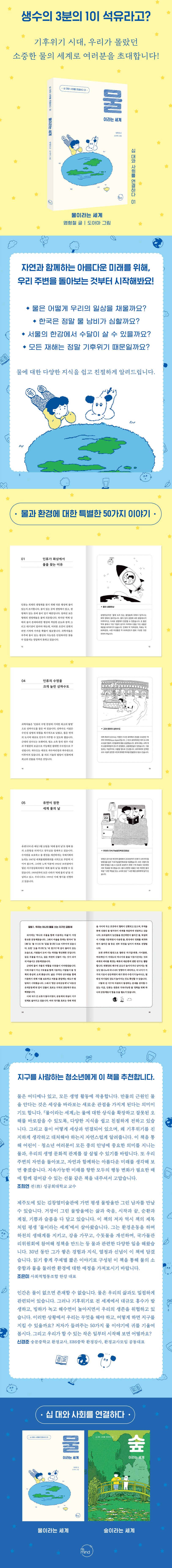 『물이라는 세계』는 우리가 일상적으로 접하는 물과 환경에 대한 50가지 지식을 귀여운 그림과 함께 소개하고 있습니다.