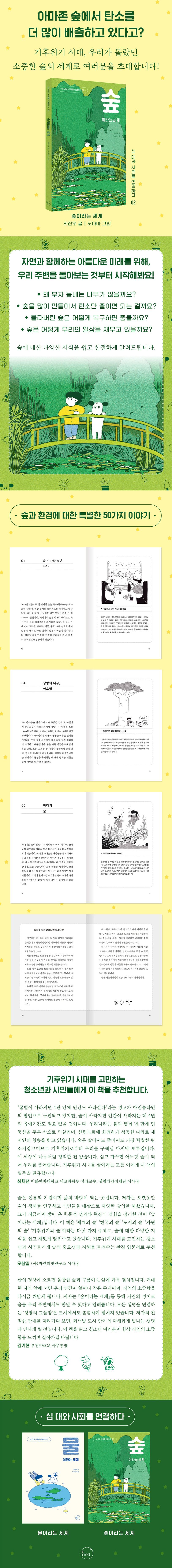 숲은 인류의 기원이며, 생명의 바탕이 되는 곳입니다. 하지만 우리는 숲의 가치를 알아보지 못하고 함부로 대하는 경우가 많습니다. 『숲이라는 세계』는 우리가 일상적으로 접하는 숲과 환경에 대한 50가지 지식을 귀여운 그림과 함께 소개하고 있습니다. 누구나 쉽게 읽으면서 지구의 자연과 숲을 좀 더 가깝게 느낄 수 있도록 ‘세계의 숲’ ‘한국의 숲’ ‘도시의 숲’ ‘자연의 숲’ ‘기후위기와 숲’이라는 5개의 챕터로 구성되어 있습니다. 저자가 들려주는 이야기와 그림을 따라가다 보면 숲이 어떻게 세상과 연결되어 있으며, 왜 기후위기를 진지하게 생각하고 대처해야 하는지 자연스럽게 알 수 있습니다. 이 책을 통해 독자 여러분이 우리 주변의 자연을 돌아보고, 자연과 함께하는 아름다운 미래를 생각해 보는 시간이 되기를 바랍니다.