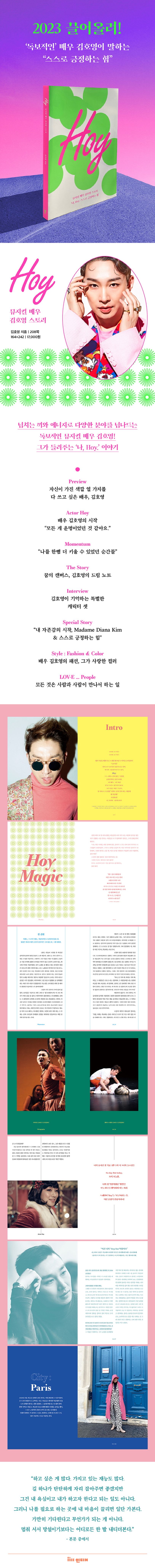 넘치는 끼와 긍정적인 에너지로 뮤지컬, 드라마, 예능, 트로트, 홈쇼핑, 유튜브 등 다양한 분야에서 활약하고 있는 독보적인 배우 김호영. 데뷔 20년차인 현재, 무대를 넘어서서 새로운 시도를 멈추지 않고, 사람들에게 유쾌함을 선물하고 있는 배우 김호영의 에세이 『Hoy』가 출간되었다. 처음 배우가 되었던 계기, 대학교 재학 시절 임했던 〈렌트〉 오디션에 합격하며 ‘엔젤’로 데뷔했던 순간, 배우로서 인간으로서 성장할 수 있었던 사건들, 꿈을 구체적으로 그리기 시작한 ‘드림 노트’, 다양한 분야에 도전하는 자기만의 이유, 높은 자존감의 원천인 어머니, 인간 관계를 맺고 유지하는 힘, 함께하는 사람들에 대한 소중함 등, ‘독보적인’ 배우이자 인간 김호영의 이야기다. 표지에서부터 본문에 이르기까지 저자만의 색깔을 반영해 ‘매거진’ 스타일로 새롭게 구성했다.