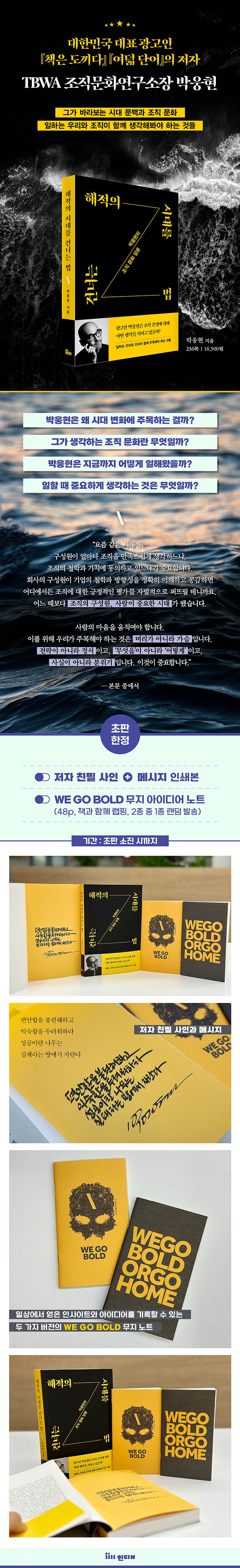 대한민국 대표 광고인이자 『책은 도끼다』 『여덟 단어』 『문장과 순간』 『인문학으로 광고하다』 등의 저서로 유명한 박웅현이 ‘조직 문화’에 대한 생각을 풀어놓은 책이다. 저자는 오랜 시간 광고를 만들어 왔던 감각으로 2015년부터 기업 브랜딩 컨설팅을 해왔고, 2022년 TBWA 조직문화연구소를 설립한 후 여러 기업과 다양한 프로젝트를 진행해왔다. 그 과정에서 기업과 조직 구성원들의 고민을 가까이에서 보고 들으며 요즘 조직 문화가 왜 유난히 문제인지, 어떻게 조직 문화에 접근해야 하는지 정리해보게 되었다고 말한다. 그에 따르면 대한민국을 급속하게 성장시켰던 ‘시스템의 시대’는 지나갔고 이제는 민첩하고 기민하게, 유연하고도 담대하게 움직여야 하는 ‘해적의 시대’이다. 저자는 이와 같은 시대에 조직이 살아남기 위해서는 시대 문맥에 맞는 방식으로 변모해야 하며, 무엇보다 구성원을 주목해야 한다고 말한다. 바로 ‘사람’이 중요하다는 이야기다. 저자는 소비자의 마음을 움직였던 광고인의 감각으로 어떻게 조직 구성원의 마음을 움직일 수 있는지, 조직 문화가 조직의 창의성과 어떤 연관이 있는지 세심하게 짚어낸다. 여기에 더해 요즘 화두인 ‘세대 갈등’에 대해 저자만의 생각도 함께 풀어놓았다. 조직 생활과 조직 문화에 대한 독자들의 질문과 저자의 답이 부록으로 담겼다.