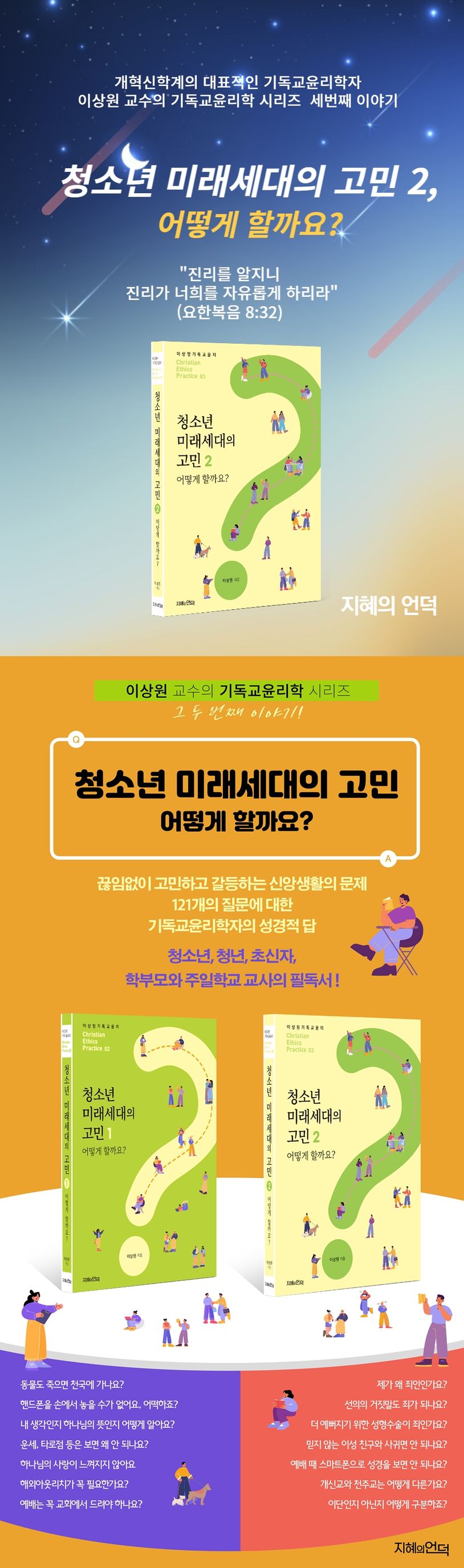 이 책은 개혁신학계의 대표적 기독교윤리학자인 이상원 교수가 청소년들의 신앙생활에 관한 121개의 질문에 답변한 내용을 모은 두 권의 책 중 제2권이다.