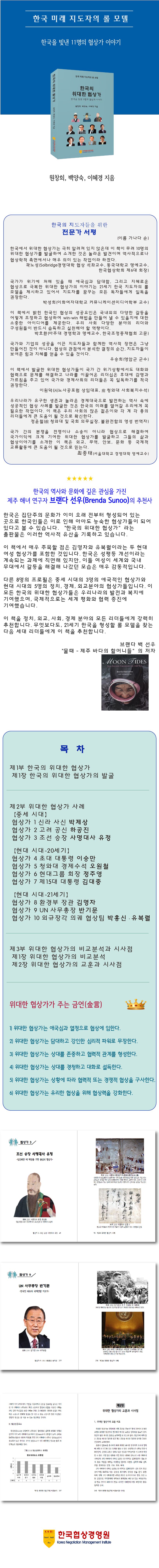 한국의 위대한 협상가는 우리나라의 국익과 국민의 복지를 위해 외국과 외교협상을 성공적으로 수행하여 이름을 빛낸 협상가를 중심으로 발굴하였다. 이렇게 발굴한 협상가는 신라 사신 박제상, 고려 공신 하공진, 조선 승장 사명대사, 초대 대통령 이승만, 청와대 경제수석 오원철, 현대그룹 회장 정주영, 제15대 대통령 김대중, 환경부 장관 김명자, UN 사무총장 반기문, 외규장각 의궤 협상팀 박흥신·유복렬 등 11명으로 시대별로 분포되어 있다. 이들의 인생관과 삶의 방식 그리고 협상스킬로부터 교훈을 얻고자 하였으며 협상가들의 협상구조를 비교분석하여 미래의 지도자와 협상가를 위해 금언을 제안하였다.