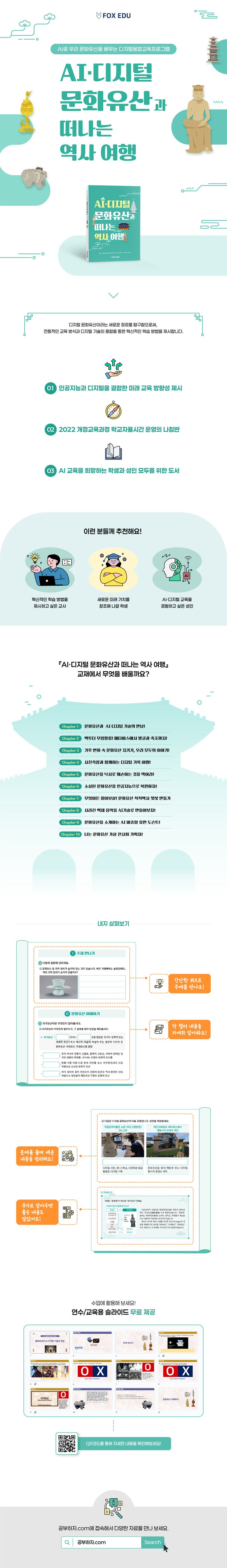 "AI·디지털 문화유산과 떠나는 역사 여행"은 AI와 디지털 기술을 통해 우리 문화유산을 배우고 미래 교육을 위한 AI 기술 역량을 키우는 교재입니다. 2022 개정 교육과정에 맞춰 개발되었으며, AI와 디지털 교육에 관심 있는 교사, 학생, 학부모를 위한 내용으로 구성되어 있습니다.