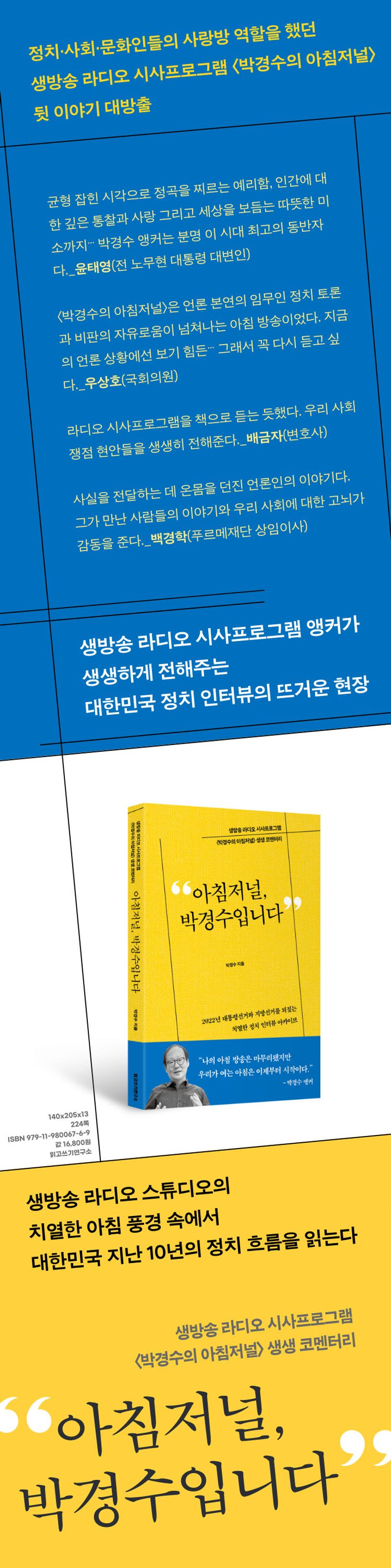 “청취자 여러분! 박경수입니다”라는 오프닝 멘트로 시작하는 이 책에서 저자는 아침 생방송을 함께한 정치인 법조인 지방자치단체장 등 인터뷰이들과의 각별한 인연, 마음에 남은 인터뷰, 스튜디오를 뜨겁게 달군 뉴스와 인물들에 대한 코멘트로 대한민국 정치 이슈의 한가운데 있었던 순간들을 돌아본다.