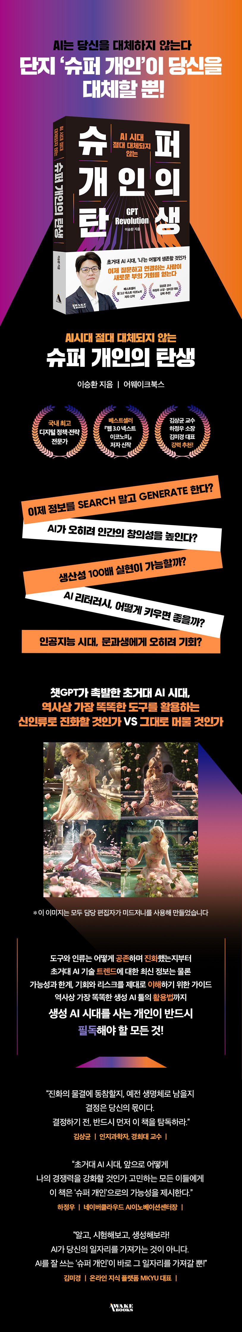 『슈퍼 개인의 탄생』은 국내 최고의 디지털 전략 연구가이자 베스트셀러 『웹 3.0 넥스트 이코노미』 저자 이승환 박사가 초거대 AI 시대를 사는 최초의 인류인 우리에게 인공지능과 협업하고 공존하며 진화할 것을 역설하는 자기계발서이다. 대생성의 시대, 나는 어떻게 생존할 수 있을지 고민하는 모든 이들이 인공지능에 대한 막연한 불안감을 해소하고, 도구로서의 인공지능을 정확히 이해하며, 지금 필요한 마인드셋을 장착해 변화에 대응할 수 있도록 돕는 책.