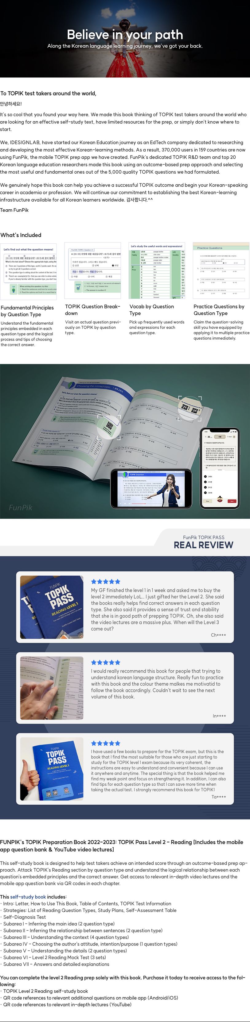 This self-study book is designed to help test takers achieve an intended score through an outcome-based prep approach. Attack TOPIK's Reading section by question type and understand the logical relationship between each question's embedded principles and the correct answer. Get access to relevant in-depth video lectures and the mobile app question bank via QR codes in each chapter.
