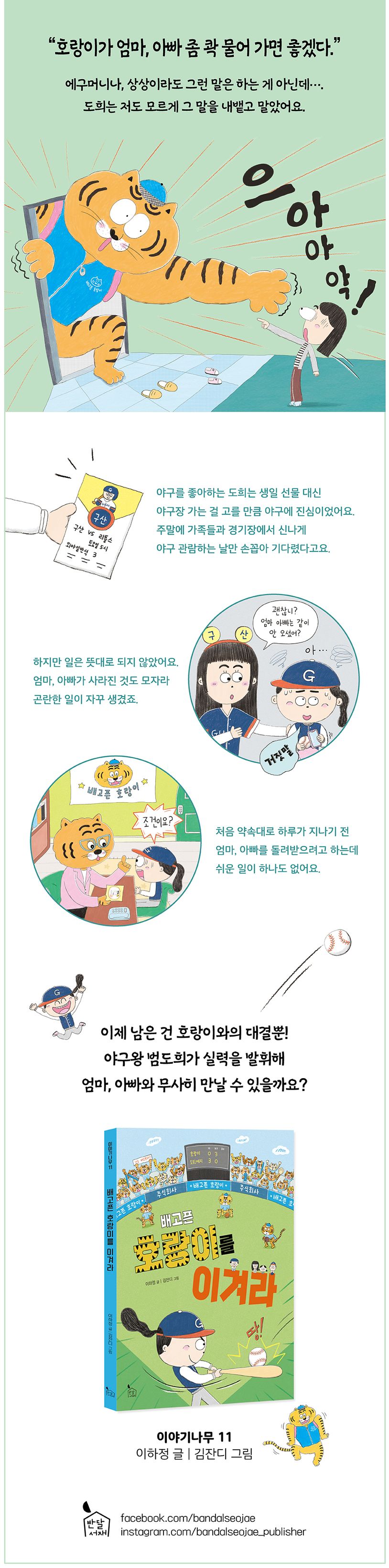 호랑이는 엄마, 아빠를 데려갔다는 확인증 한 장만 달랑 남기고 떠났다. 갑자기 일어난 일이라 정신이 없었지만, 도희에게는 내일 야구 경기를 볼 수 있는 기회이기도 했다. 딱 하루만 엄마, 아빠를 호랑이에게 맡겨 두었다가 되찾으면 문제될 게 없다고 생각했다. 그때까지만 해도…….