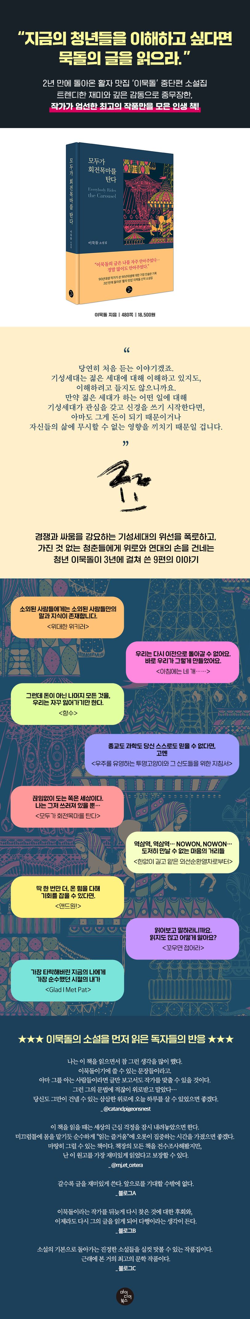 그럼에도 이묵돌의 소설을 기다리고, 열렬하게 환영하는 목소리가 심상치 않다. 그의 소설은 두 가지에 충실하다. 재미와 사명. ‘활자 맛집’이라는 별명답게 그의 소설은 기승전결 서사적 완성도뿐만 아니라 트렌드를 관통하는 날카로움과, 함께 살아가기 위해 서로의 어깨를 내어주는 사람들의 끈끈한 연대가 담겨 있어 재미와 소설적 사명을 동시에 충족시킨다. 오랫동안 기다려왔다. 이묵돌이 3년에 걸쳐 쓴 최고의 작품만을 모은 소설집 〈모두가 회전목마를 탄다〉를 당장 펼쳐보자. 단언컨대 이 버릇없는 책은 당신의 기대를 결코 실망시키지 않을 것이다.