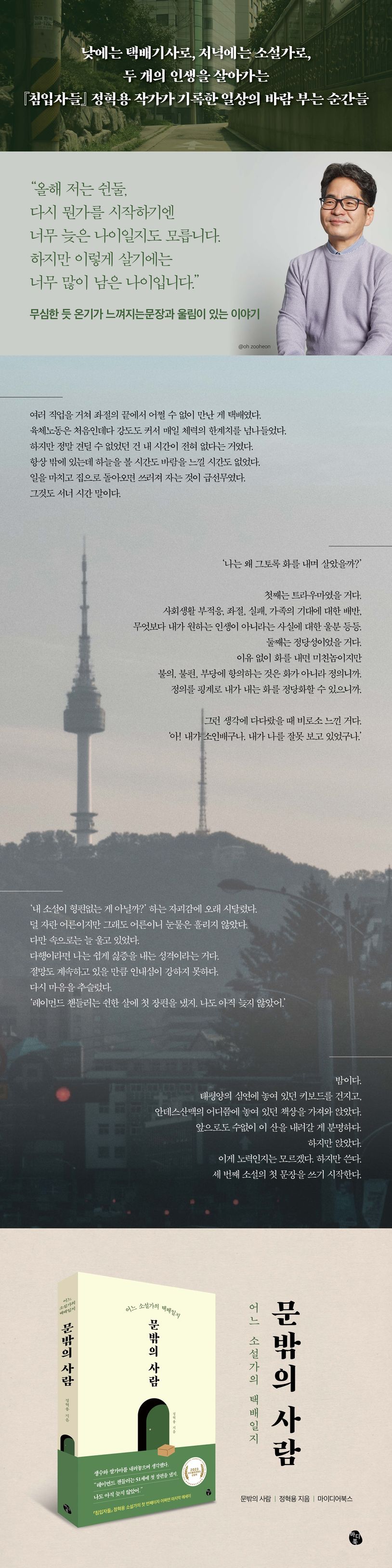 그래서 쓰기 시작했다. 낮에는 택배를 배달하고, 저녁에는 꾸벅꾸벅 졸면서 휴대전화에 글을 썼다. 그렇게 2020년 첫 책 『침입자들』을 출간했다. 이듬해에는 두 번째 책 『파괴자들』도 출간했다. 하지만 택배를 그만둘 수는 없었다. 인세만으로 먹고살기엔 여전히 삶이 버거웠기 때문이다. 그래도 작가는 이제 한겨울 아파트 화단의 경계석에 앉아 울지 않는다. 내 팔 내가 흔들어 먹고사는 노동자의 삶이, 밤마다 소주 한 잔을 곁에 두고 글을 쓰는 작가로서의 삶이 자신에게 어울린다는 사실을 알기 때문이다. 이 책은 그렇게 노동자이자 작가로 살아가는 정혁용 작가가 기록한 바람 부는 일상의 순간들이다.
