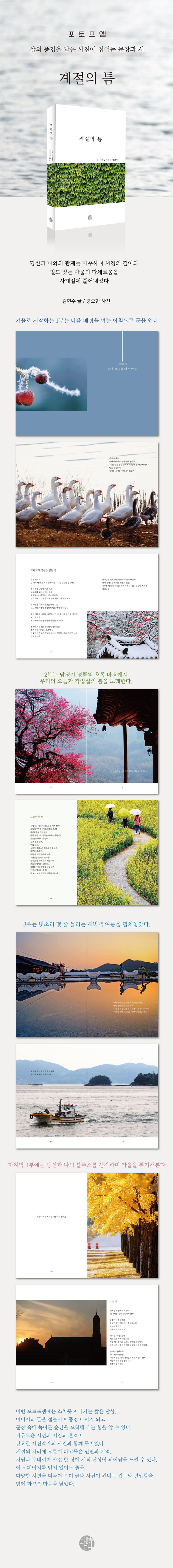 계절의 틈은 2018년 전북일보 신춘문예로 등단한 김헌수 시인의 포토포엠 시집이다. 삶의 풍경을 담은 사진에 접어둔 문장과 시편들을 곁들였다. 순환하며 사는 일상의 또렷한 장면과 당신과 나와의 관계를 마주하며 서정의 깊이와 밀도 있는 사물의 다채로움을 사계절에 풀어내었다.