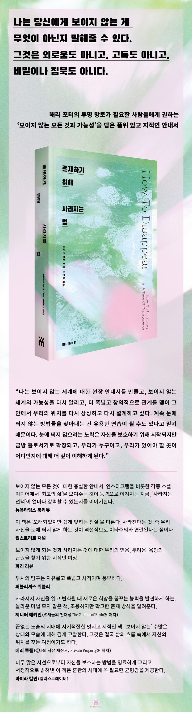 끊임없는 노출과 연결에 피로해진 사람들을 위한 ‘해독제’ 같은 에세이. 저자 아키코 부시는 보이지 않는 상태의 의미, 근원 등을 다양한 사례와 경험으로 고찰하는 한편 생물학자, 물리학자, 심리학자, 예술가, 작가 들과 대화를 나누고 그랜드케이먼 섬 바닷속, 아이슬란드 항구 도시에서 물리학 실험실과 가상현실 스튜디오까지 여러 곳을 여행하며 ‘보이지 않는 세계’에 대한 섬세하고 지적인 안내서를 완성했다. 이 책은 해리 포터의 ‘투명 망토’가 없이도 보이지 않거나 사라지는 상태를 스스로 선택할 수 있다는 매력적이고 흥미로운 가능성, 그리고 그로부터 얻을 수 있는 많은 것들, 눈에 띄지 않는 삶의 가치, 그리고 세계와의 연대를 이야기한다.