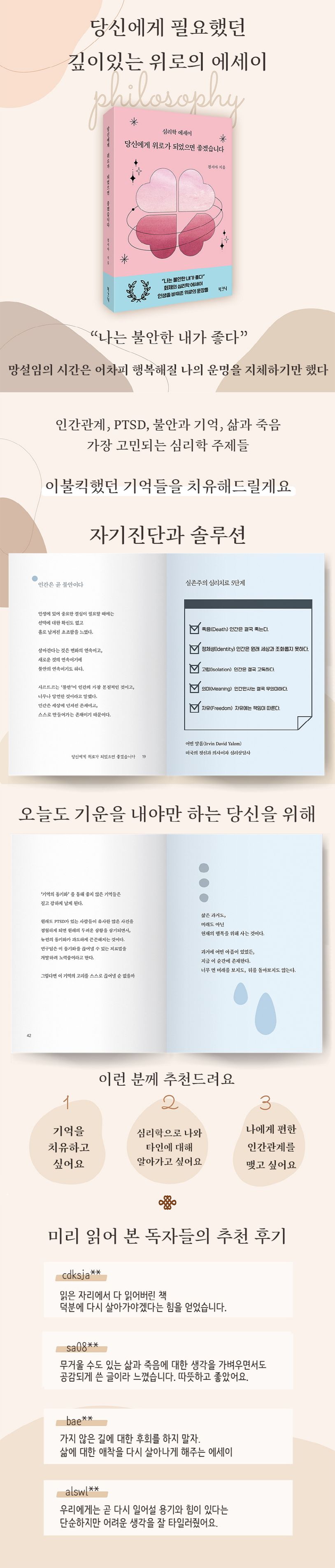 PTSD 극복, 나의 죽음을 받아들이는 방법, 나에게 편한 인간관계 맺는 법, 무례한 사람을 대하는 법 등 불안한 기억을 치유하고, 삶에 위로를 받고 싶다면 꼭 읽어야 할 심리학 에세이가 탄생했다. 오늘도 기운을 내야만 하는 당신을 위한 문장들. 니체, 아들러, 데일 카네기, 사르트르의 심리학과 철학을 재해석하여 삶에 녹아든 따뜻한 위로의 말들로 담아냈다.