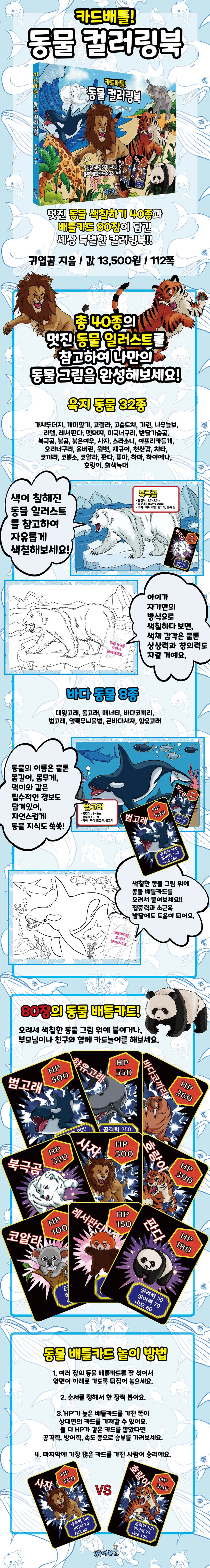 고릴라, 고슴도치, 기린, 미국너구리, 북극곰, 불곰, 사자, 재규어, 코끼리, 코뿔소, 코알라, 판다, 호랑이, 회색늑대 등의 육지 동물과 대왕고래, 돌고래, 매너티, 바다코끼리, 범고래, 얼룩무늬물범, 큰바다사자 등의 바다 동물로 이루어진 총 40종의 멋지고 귀여운 동물 색칠놀이를 즐길 수 있는 컬러링북이에요. 부록으로 80장의 동물 배틀카드가 들어있어, 오려서 본문 그림 위에 붙이거나 카드놀이를 즐길 수도 있어요.