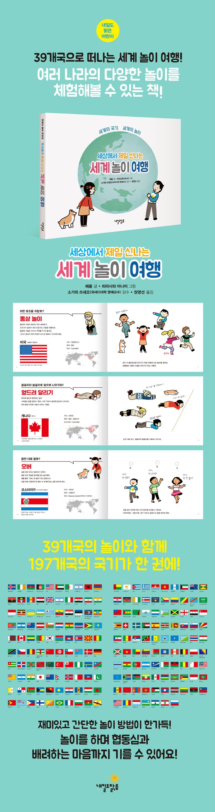 봉지 이인삼각, 동물 흉내 게임, 컵 릴레이 등 아메리카, 유럽, 아프리카, 오세아니아, 아시아의 많은 아이들이 즐기는 놀이를 소개하는 이 책은 간단한 규칙과 함께 그 나라의 국기와 수도, 언어, 인사말까지 알려주하고 있어 놀이뿐만 아니라 그 나라에 대한 간단한 정보도 익힐 수가 있다. 또 마지막 부분에는 197개국의 국기가 실려 있어 익숙한 나라는 물론 처음 들어보는 생소한 나라의 이름과 국기를 찾아보는 재미도 있다.