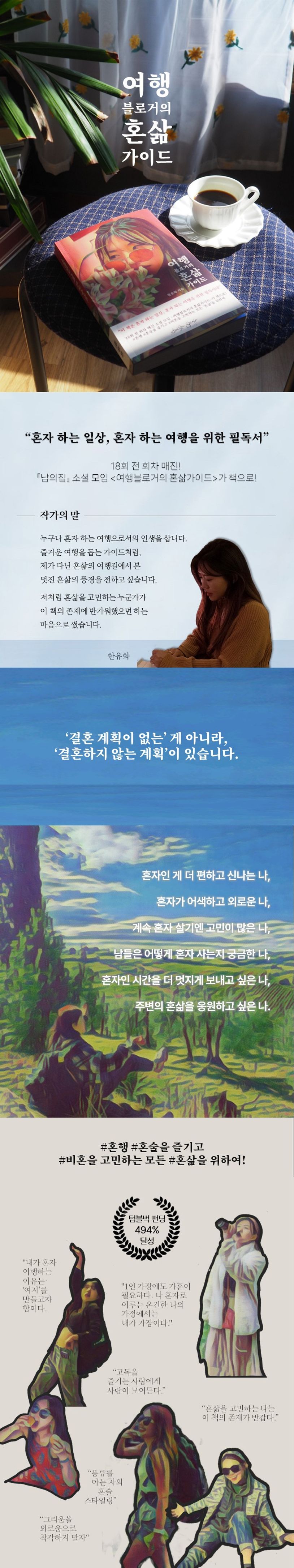 텀블벅 펀딩 494%를 달성한 '1인 가정의 정서적 지침서' 같은 책이다. 쿠바, 인도, 심지어 축제와 휴양지의 허니문 풀빌라까지도 혼자 여행하는 저자가 겪은 에피소드를 통해 탄탄한 혼삶을 통해 배우고 적용할 것들을 진중하고 유쾌하게 담아낸다.