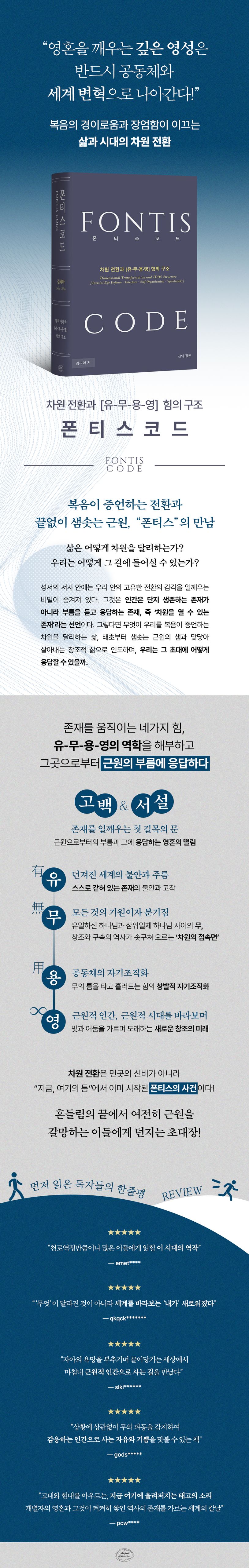 이 장대한 여정 속에서 독자는 깨닫게 된다. 차원 전환은 먼곳의 신비가 아니라 근원적 현재(Fontis)의 사건이며, “지금, 여기의 틈”에서 이미 시작되었다는 것을. 우리의 삶과 공동체는 여전히 그 샘과 연결되어, 사랑과 일치의 질서 안에서 다시 배열될 수 있음을 일깨워준다. 생생함이 사라진 자리에서 새로운 숨결을 찾고 싶은 이들에게, 도그마가 아닌 살아 있는 진리를 갈망하는 이들에게, 그리고 남은 자 ̄복음을 들고 산을 넘는 자들, 진리로 깨어나기를 원하는 이들, 새로운 삶의 문화를 세우는 그리스도의 군사들 ̄에게 《폰티스코드》는 길을 밝혀주는 가장 신뢰할 만한 지적·영적 지도가 될 것이다.