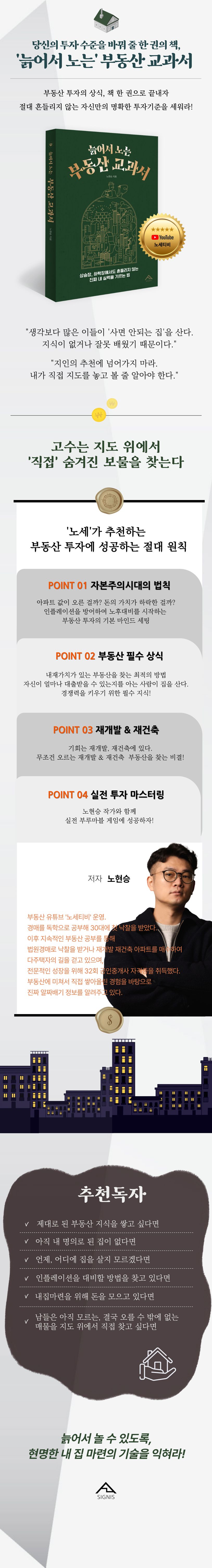 우리나라에서 많은 이들이 인정하는 사실이 있다. 바로 대한민국에서 부자가 되려면 부동산 투자를 해야 한다는 것. 이 사실을 일찍이 깨달은 작가가 20대부터 맨땅에 헤딩으로 공부하기 시작한 부동산 투자였다. ‘사람들은 자신처럼 머리 아프게 공부하지 않고 처음부터 핵심을 알고 공부하면 좋을 텐데’하는 마음에 이 책을 썼다. 처음 시작하는 사람들도 쉽고, 완벽하게, 한 권으로 정리할 수 있을까? 하는 고민이 있었다. 그렇게 『늙어서 노는 부동산 교과서』가 탄생했다.