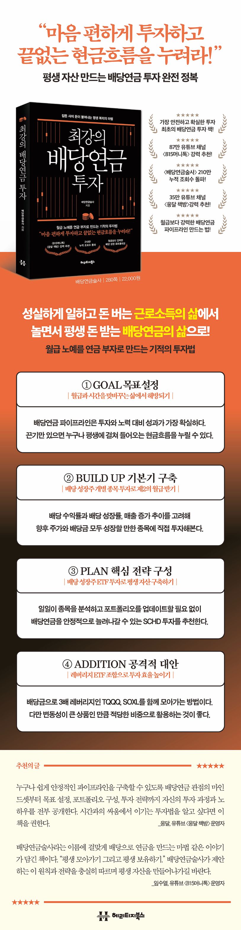 이 책은 배당연금 관점의 마인드셋부터 목표 설정, 포트폴리오 구성, 투자 전략까지 배당연금 투자에 관한 모든 것을 안내한다. 이 책의 저자 배당연금술사는 성공과 실패를 거듭하며 발전해나간 자신의 투자 경험과 그 과정을 예시로 적극 활용한다. 거기에 투자 성향이 서로 다른 아내(안전지향성)와 자신(성장지향성)의 최근 포트폴리오까지 낱낱이 공개한다. 어떤 투자를 할 때 어떠한 결과를 얻을 수 있는지 숫자로 직접 확인시켜주고 장단점까지 꼼꼼히 분석해 살펴봄으로써 투자자 스스로 자신에게 알맞은 선택을 하도록 돕는다. 어떻게 시작해야 할지 망설였던 입문자, 이제 막 투자 공부를 시작한 초보자, 지금보다 더 탄탄한 파이프라인을 만들고 싶은 배당연금 투자자 모두에게 유용한 한 권이 될 것이다.