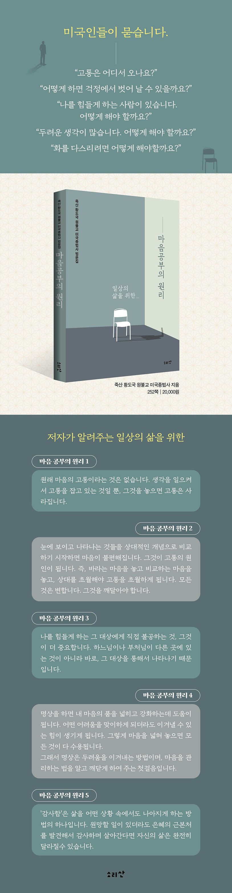 이 책은 원불교 미국 종법사인 저자가 미국인들의 마음의 고통에 대한 질문에 답변한 내용과 법설을 모은 법문집이다. 〈1장 마음공부가 궁금합니다〉에는 극도로 발달한 물질 문명의 세계를 살아가는 현대인들의 구체적 고민에 답변하는 내용이 담겨 있다. “나를 힘들게 하는 사람이 있습니다. 어떻게 해야하나요?” “두려움이 많습니다. 어떻게 해야할까요?” “고통은 어디서 오나요?” 이러한 질문들에 대한 답변을 통해 잃어버린 본래의 평온한 마음을 되찾는 원리를 설명한다.