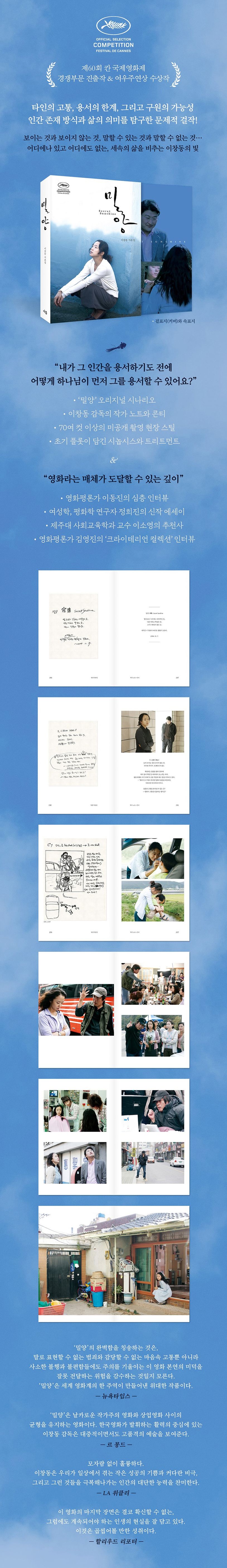 이창동 감독의 네 번째 연출작 ‘밀양’(2007)이 영화 개봉 15년 만에 각본집으로 출간됐다. ‘밀양’은 우리나라 최초의 칸 국제영화제 여우주연상(전도연) 수상이라는 쾌거와 더불어 국내외 평론가들로부터 비평적 상찬을 받았고, 참여정부에서 문화부장관을 지낸 이창동 감독의 영화계 복귀작이라는 기대감, 치열했던 촬영 현장에서의 일화들, 영화 속 상황의 극적 충격, 특정 종교와 관련한 논란 등 숱한 화제를 모았다. 그해 ‘밀양’은 국내외 유수의 영화제에서 수상(작품상, 감독상, 여우주연상, 남우주연상 등)의 영예와 “거장의 위대한 작품”이라는 찬사를 동시에 받았다.