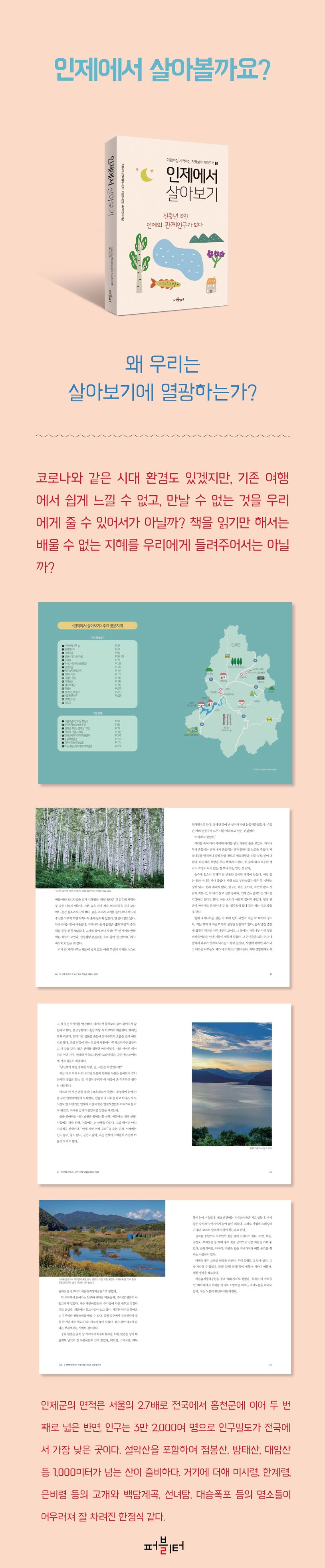 인구밀도는 전국에서 가장 낮지만, 각양각색의 일과 활동, 커뮤니티와 기관들이 있었다. 이 책은 인제의 멋진 자연과 문화뿐 아니라 20대에서 70대에 이르는, 인제의 가장 멋진 자원인 사람 간의 만남을 기록한 책이며 지난 2020년 발간했던 〈남원에서 살아보기〉, 2022년 발간했던 〈강릉에서 살아보기〉에 이은 ‘여행처럼 시작하는 지역살이 가이드북’세 번째 책이다.