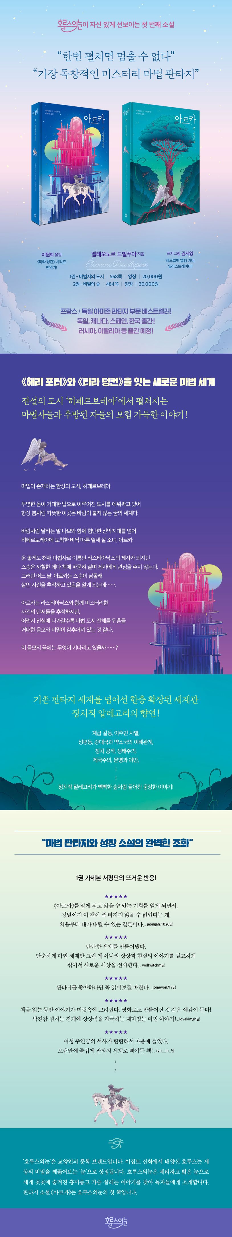 소설 《아르카》에서 히페르보레아와 아마조네스 신화를 비롯한 서양의 전설적 테마들은 작가만의 독특한 상상력을 거쳐 완전히 새롭고 신비한 이야기로 재창조된다. 작가는 놀랍도록 탁월한 이야기의 힘으로 마법 판타지에 스릴 넘치는 추리 수사물을 스며들게 하고, 나이 어린 주인공들을 통해 가슴 뛰는 성장 이야기의 묘미를 제대로 살려낸다. 모든 등장인물은 입체감 있게 움직이며 이야기의 주요한 축을 이루고, 곳곳에 숨어 있는 장치들이 때맞춰 ‘회수’되며 놀라움과 짜릿함을 선사한다. 눈앞에 보이는 듯한 생생한 묘사와 생동감 넘치는 전개는 마치 영화를 보는 것 같은 착각마저 들게 한다. 책을 펼치는 순간, ‘청소년부터 어른까지 모두가 만족할, 깊은 울림을 주는 책’이라는 언론의 찬사에 수긍할 수밖에 없게 된다.