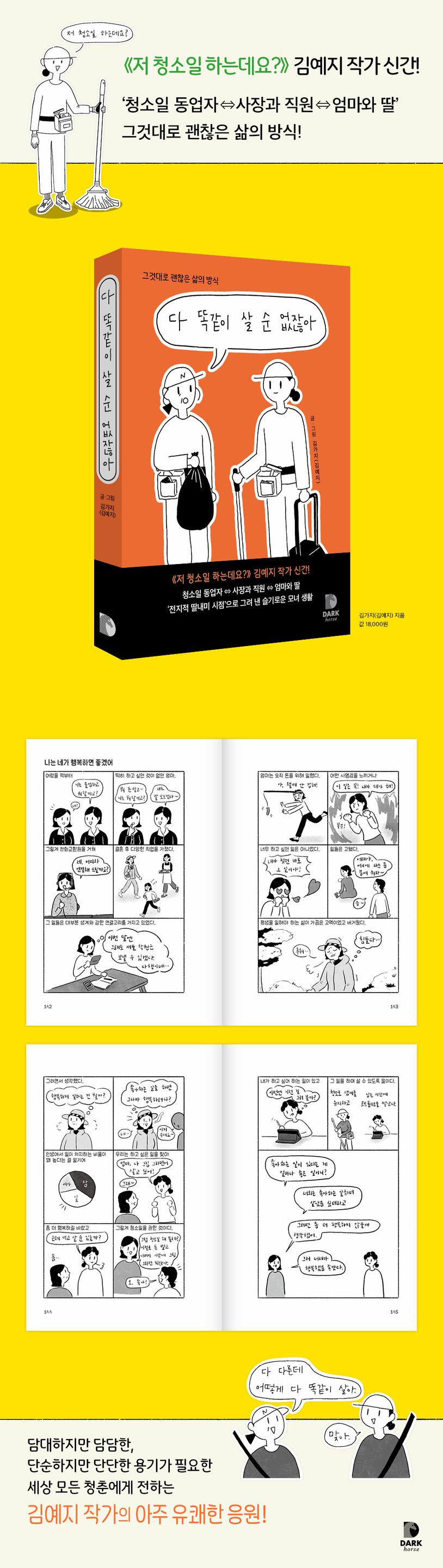 더불어 청소일 동업자에서 사장과 직원 그리고 다시 엄마와 딸로 연결되는 공적이지만 지극히 사관적인 관계 속에서 ‘엄마’라는 이름의 인생 선배에게 배운 삶의 단단한 내공과 느낌을 글과 그림으로 엮어냈다. 단순한 모녀 관계를 넘어 ‘좋은 관계란 무엇일까?’에 대한 고찰을 김예지 작가 특유의 시선으로 그려낸 것이다.
