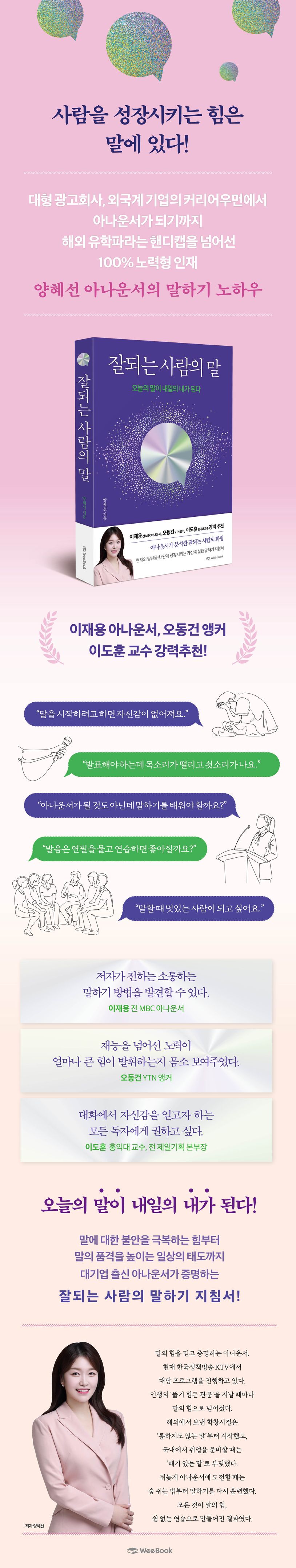 스스로 ‘철저하게 만들어진 아나운서’로 표현하는 양혜선 아나운서는 말하기에 대한 두려움과 불안을 가진 이들에게 자신이 좋은 본보기라 말한다. 핸디캡 투성이였던 저자 자신이 말이 본업이 아나운서가 됐다면 말하기가 두려운 모든 사람이 해낼 수 있다고 역설한다. 저자가 책을 통해 말에 대한 경험과 지식뿐 아니라, 말에 대한 소신까지 담아내고자 노력한 이유이다. ≪잘되는 사람의 말≫은 저자 특유의 연습 방법은 물론 일과 사람, 관계와 소통이 잘되는 사람들의 생생한 예시를 담고 있다. 말을 잘하고, 제대로 활용하고자 하는 독자들에게 손에 잡히는 해법을 제시할 것이다.