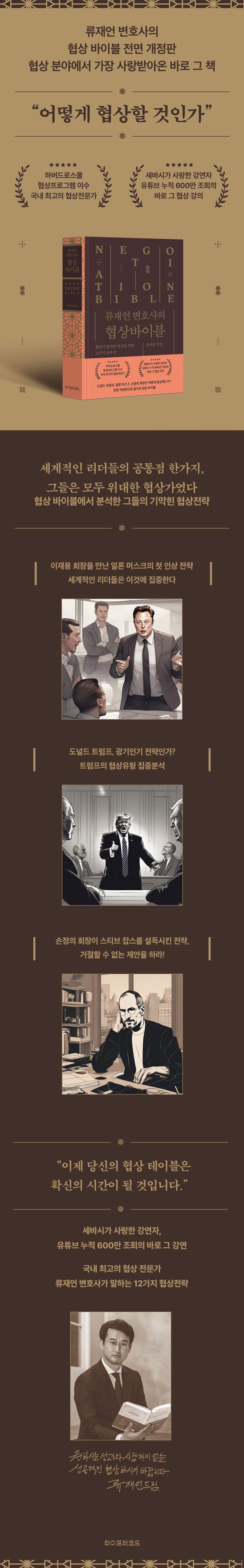 협상분야에서가장사랑받아왔던바로그책!유튜브누적600만조회,협상은어떻게삶에무기가되는가?국내최고의협상전문가류재언변호사가집대성한협상력강화절대공식.도널드트럼프와일론머스크등세계적리더들의공통점,그들은위대한협상가이다."어떻게협상할것인가""협상력의차이는무엇으로결정되는가"하버드로스쿨협상프로그램을이수한국내최고의협상전문가류재언변호사가이야기하는'협상에대한모든것'그어느때보다협상이중요한시대다.도널드트럼프,일론머스크,스티브잡스,손정의,오타니쇼헤이까지,시대를이끌어간세계적인리더들은모두위대한협상가(Negotiator)였다.우리는리더의협상력에따라국가와기업의미래가어떻게좌우되는지생생히지켜보았다.지금뿐만이아니다.세계의지형을바꾼역사적장면들속에는반드시결정적협상의순간들이있었다.일방적이고성급한방법대신지속적인대화와서로윈윈(Win-Win)이될수있는거절할수없는대안의발굴로갈등을딛고공존과협력을이끌어낸세계의지도자와리더들의이야기속에협상이있다.개인에게도협상은중요한문제다.연봉협상,임대차협상,매매협상등우리는일상에서나와입장이다른상대방과최선의합의점을찾기위해매일같이의견을조율하며협상에임한다.협상력을키운다는것은우리삶을조금더윤택하게만드는법을터득하는것이다.『류재언변호사의협상바이블』은매일같이협상을경험하지만이에대해제대로배워본적없어늘불안하고난처하기만했던이들을위해12가지협상원칙으로체계적인솔루션을제시한다.류재언변호사는기업분쟁을다루는로펌의대표이자벤처캐피탈리스트로,하버드로스쿨협상프로그램(PON)을이수한국내최고의협상전문가이다.그가설립한비즈니스협상전략그룹(BNSG)을통해기업과정부의리더와협상실무자들을대상으로협상력강화교육을활발히진행해왔다.『류재언변호사의협상바이블』은리더들이극찬했던협상강연내용을바탕으로,비즈니스현장뿐아닌일상속에서누구나활용할수있는다양한협상전략들을총망라하여담았다.