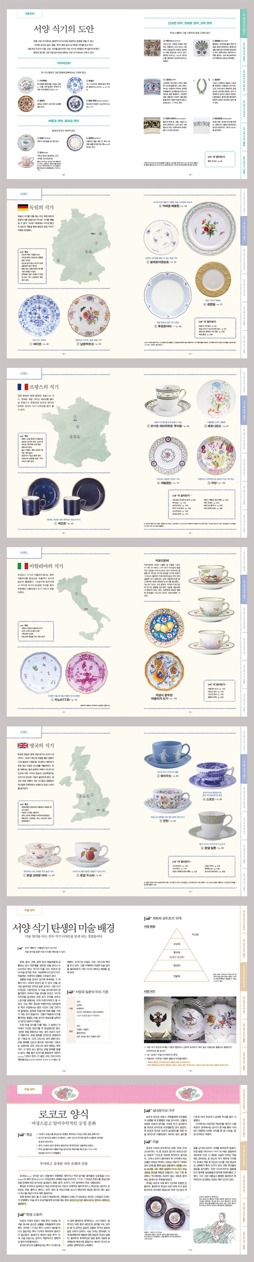 도자기의 종류와 제조법으로 시작해서 동양에서 시작된 백자가 마르코 폴로를 통해 서양으로 건너가 소개된 역사와 유럽에서 ‘자기=백금’으로 인식되며 모방과 기술 발전을 통해 다시 태어난 도자기의 새로운 도전을 다루고 있다. 이어 유럽 각국에서 출발한 도자기 브랜드들이 현재의 명품 도자기 브랜드로 거듭나게 된 스토리를 소개한다. 더불어 도자기의 연대기를 따라가며 이에 영향을 준 음악, 유행, 미술, 그리고 전쟁에 대해서도 다룸으로써 도자사에 대한 이해를 깊게 해주고 있다. 마지막으로 서양 식기를 실제로 사용함에서 주의할 점과 구매 시 고려할 사항 및 관리법은 물론 보기에도 예쁘면서 상황에도 맞는 테이블 세팅을 위한 조언을 아끼지 않고 있다. 또한 각 브랜드의 대표적인 패턴과 인기 디자인은 물론 좀처럼 직접 보기 힘든 귀한 앤티크 제품이나 다양한 브랜드의 풍부한 사진 자료를 활용하여 즐거운 볼거리를 제공한다.
