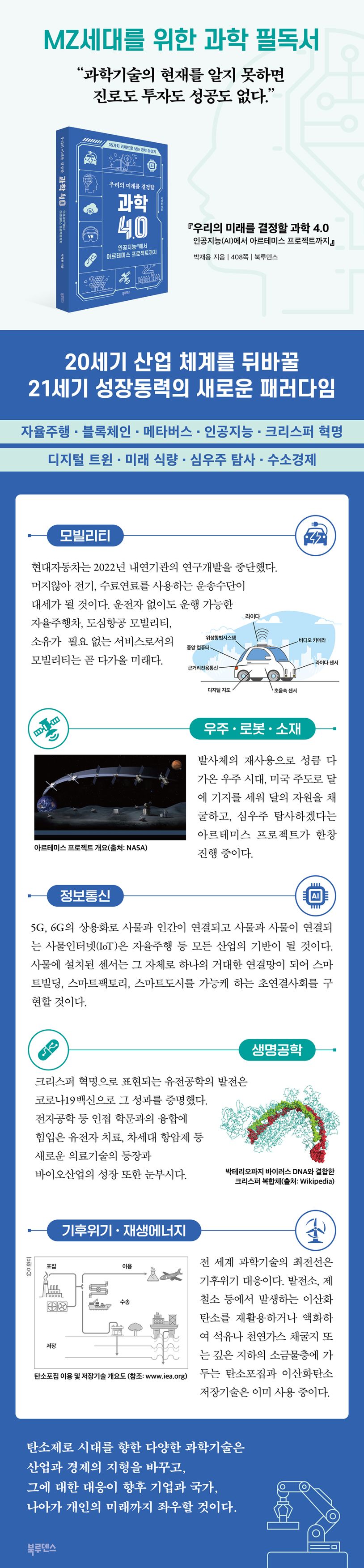 요사이과학의새로운성과들이날마다뉴스의주요이슈로등장하면서정치를가려버릴지경이다.인공지능,자율주행,블록체인,전기자동차,크리스퍼혁명등등.뉴스를보고정보를찾아봐도비전공자들은그내용을선뜻파악하고흐름을따라잡기쉽지않다.우리삶의변화를주도하는과학기술이우리를어떤미래로이끌지저자의설명을차근차근따라가보자.