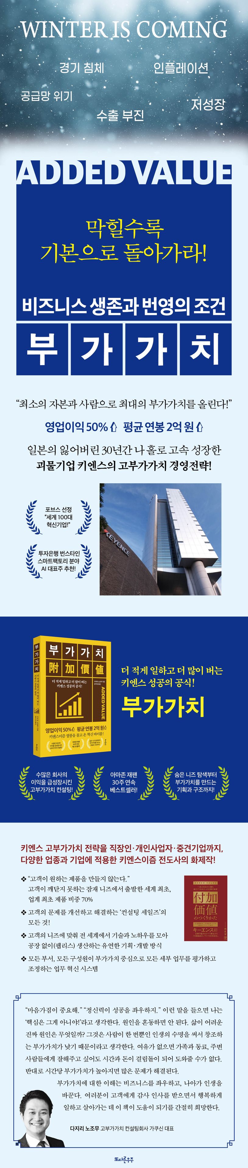 저자는삶이어려운이유는사람이한번뿐인인생의수명을써서창조하는부가가치가낮기때문이라고얘기한다.키엔스를그만두고처음창업했을때그는처절하게실패했고,우연히들어간요식업체에서저임금장시간노동에시달렸다.처가에얹혀살며가족을부양하기에턱없이적은급여에좌절하면서,키엔스의고부가가치경영전략을어떻게다른업체,다른업종에도적용할수있을지치열하게고민하고모색한끝에컨설팅회사를창업,오늘에이르렀다.