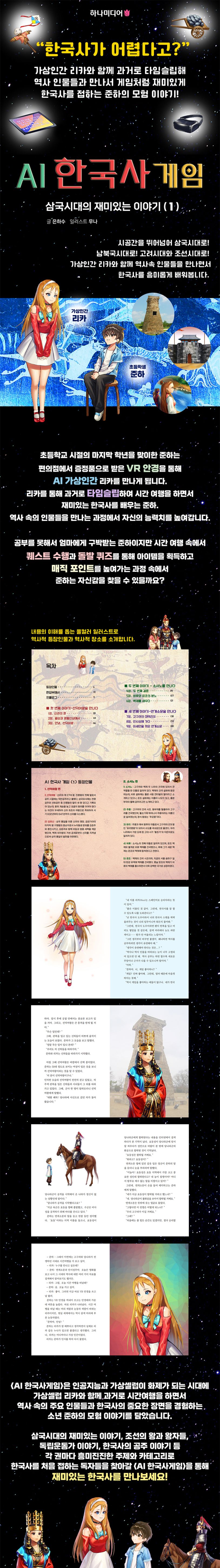 〈AI 한국사게임〉은 인공지능과 가상셀럽이 화제가 되는 시대에 가상셀럽 리카와 함께 과거로 시간여행을 하면서 역사 속의 주요 인물들과 한국사의 중요한 장면을 경험하는 소년 준하의 모험 이야기를 담았습니다.