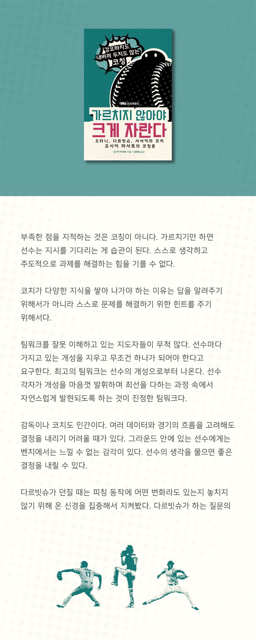 지도자의 일방적인 지시와 명령, 팀을 위해 희생을 강요하는 맹목적인 집단주의와 절대 복종 문화, 선수 개인의 특성을 고려하지 않는 획일적인 단체훈련, 그리고 정신력 만능주의! 일제 시대부터 전해져 온 이러한 제국주의의 관행들은 여전히 우리의 스포츠 문화에 깊이 스며들어 있다. 하지만 정작 일본은 세계와의 다양한 교류를 통해 개인의 개성을 존중하고, 커뮤니케이션과 과학적 사고를 중시하는 문화로 스포츠 전반의 체질을 바꿔가고 있다. 요시이 마사토는 혁신의 결과가 서서히 드러나고 있는 일본 스포츠의 상징과도 같은 인물이다. 그는 젊은 인재가 잠재력을 한껏 터뜨리기 위한 조건들을 이야기한다. 그가 내세우는 방식은 일본 스타일의 일방적인 가르침도, 미국 스타일의 방임주의도 아니다. 관심을 기울이지만 간섭하지 않고, 조용히 지켜보지만 드러나지 않게 힌트를 주는, 철저히 선수가 중심이 되어 이루어지는 코칭이다. 최근 일본 야구는 오타니, 다르빗슈, 사사키와 같이 놀라운 퍼포먼스를 보여주는 선수들을 세상에 내놓고 있다. 이 세 명은 모두 요시이 마사토와 함께 시간을 보냈다. 이 책은 무엇이 그런 '우연'을 낳았는지 힌트를 주고 있다.