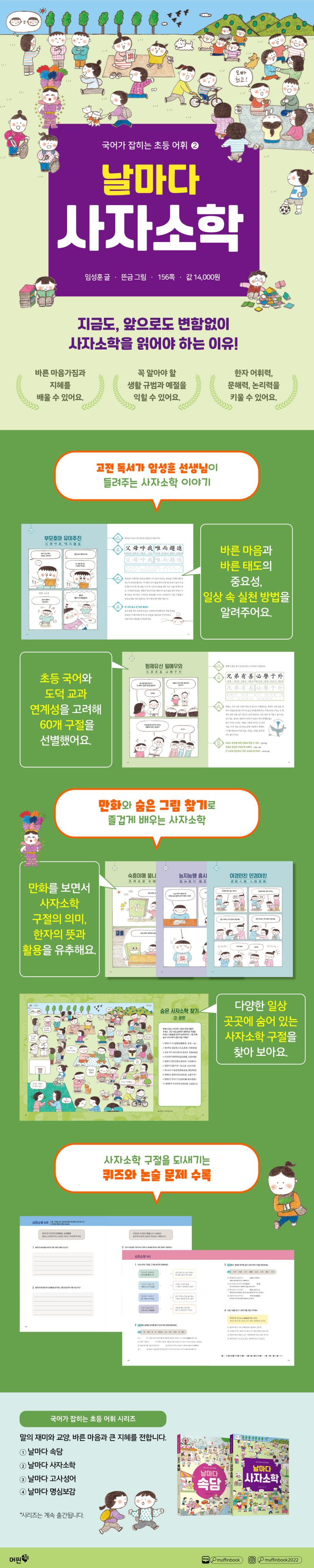 《날마다 사자소학》은 이렇게 중요한 사자소학을 틈나는 대로 짬짬이 새길 수 있도록 구성하였어요. 먼저 사자소학의 내용이 담긴 일상 속 에피소드를 재미있는 만화로 엮어 보여 주고, 뜻풀이를 실어 한자의 뜻과 활용을 유추할 수 있게 했어요. 나아가 비슷한 옛이야기, 속담, 격언, 고사성어, 인물 일화 등도 함께 수록해 사고력을 확장할 수 있지요. 각 장의 말미에는 ‘숨은 사자소학 찾기’ 활동을 실어 앞서 배운 사자소학 구절들을 그림 이미지로 오래 기억할 수 있게 했으며, 권말에는 사자소학의 내용과 한자를 다시금 새길 수 있는 퀴즈와 논술 문제도 수록되어 있어요.