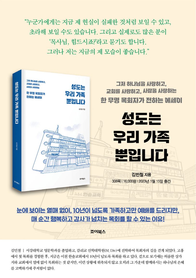 “처음엔 성도 두 명으로 시작했지만, 지금은 등록 교인만 천 명이 넘습니다!” 보통은 이런 이야기에 귀를 기울이고, 이런 성공적(?)인 결과가 있어야 하나님이 일하셨다고 믿는다. 그리고 작게나마 눈에 보이는 열매가 있어야 어떤 일이든 지속할 힘이 생기는 것은 자연스러운 일일 것이다. 그것이 교회 사역이든, 세상의 일이든 말이다. 그러나 이천 시골, 오래된 상가 지하에 자리하여 10년이 넘도록 성도가 가족뿐이지만, 한결같이 교회의 본질을 지키며 이웃 사랑을 실천하는 교회와 목회자가 있다. 광야와도 같은 시간들을 묵묵히 걷고 또 걸으며 언제 올지 모르는 성도를 위해 설교를 준비하고, 매주 같은 자리에서 온전한 예배 형식을 지키며 하나님을 예배하고 있다. 심지어 아내와 단둘이 예배할 때도 순서를 모두 지키며 예배하는 모습, 가족 외에 다른 성도가 없음에도 성찬의 의미를 나누며, 절차대로 성찬식을 하는 모습, 그리고 이웃의 아픔에 동참하고 사회적 약자들을 작게나마 돕는 모습 등은 성도 수가 많은 대형 교회와 견주어 보아도 하나님의 사랑을 듬뿍 받기에 부족함 없는 교회이다. 그저 하나님과 교회와 이웃을 사랑하기에, 그 마음으로 하루하루를 살았을 뿐이라고 고백하는 이 무명 목회자는 이 책에서 지난 10년간 하나님이 자신과 가족과 교회를 어떻게 이끌어 오셨는지를 담대하게 나눈다.