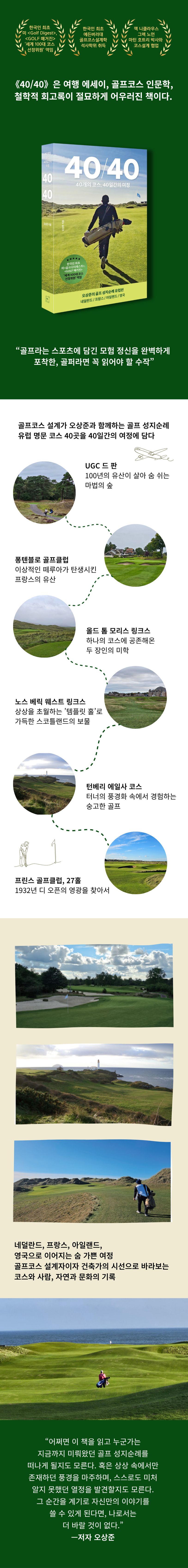《40/40: 40개의 코스, 40일간의 여정》(유럽편)은 단순한 골프 여행기를 넘어, 다양한 골프 문화에 대한 인문학적인 해석과, 자연과 사람들에게서 받은 영감을 담은 특별한 여정의 기록이다.