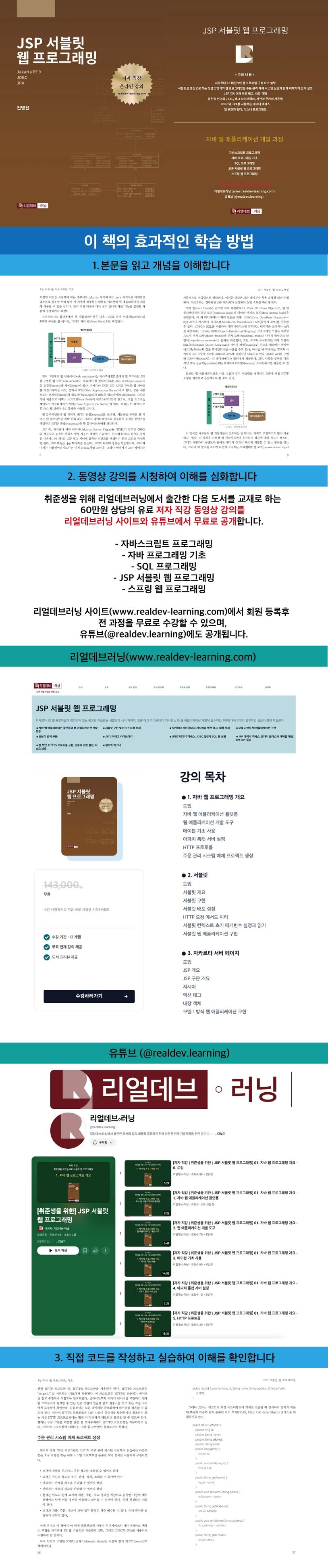 JSP 서블릿 웹 프로그래밍은 웹 애플리케이션 개발에 필수적인 API가 포함된 자카르타 EE 웹 프로파일에 정의되어 있는 서블릿과 서버 페이지, 표준 태그 라이브러리, 퍼시턴스 등의 핵심적인 주제를 다룬다.
